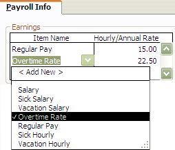 To add an overtime rate for the employee, you can do so after you have entered in the regular pay rate. Once you enter in the regular pay rate, just hit the tab key and click on the arrow to show the drop down menu as seen below.