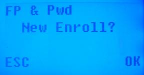 Use arrow keys to select ‘Enroll User’ or ‘Enroll Admin’ depending on which user you would like to create backup fingerprint and password for. Press ‘OK’.