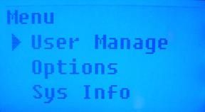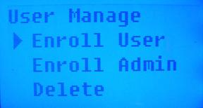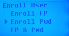 To enroll someone with just a password, Press ‘MENU’ on the key pad. This will bring up the menu below. Note that the administrator will need to verify their identity with their fingerprint to access this menu.