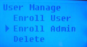 To enroll an Admin, Supervisor or Enroller with just a password, Press ‘MENU’ on the key pad. This will bring up the menu below. Note that the administrator will need to verify their identity with their fingerprint to access this menu.