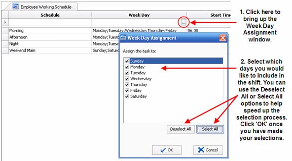Using the drop down menu under the Week Day column, select which days of the week you want to add to the shift as indicated below.