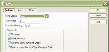 The Federal taxes tab comes up by default along with standard taxes already selected. You can change a person’s filing status here, as well as how many allowances they are claiming and any extra withholdings the employee requests.