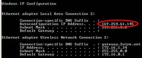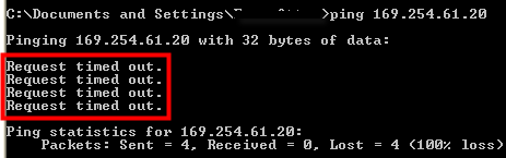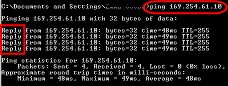 In order to find an open IP address for the T4 Device, we need to choose an address to test. To do this, in the same screen, type: ping 169.254.61.10 (you will be entering the first 3 numbers from the IP Address that comes up for your PC then changing the last number to 10).