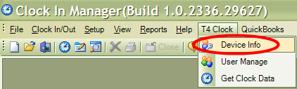 Once you have the T4 Device connected to the network and ClockMeIn up and running, go to T4 Clock, then T4 Device info as seen below.