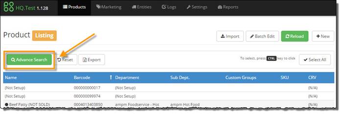 To locate a particular product or group of products you must search for the item(s). In the Product Listing use the ADVANCED SEARCH button located about the product list: