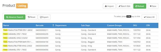 EXAMPLE: if you search by NAME for TWIX. A list of every size or variation of TWIX available in the catalog will be in the generated list: