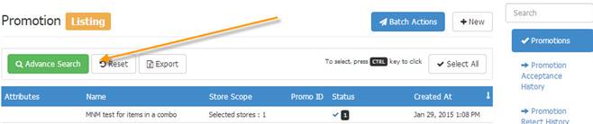 To search for an existing promotion click the Advanced Search button on the top of the screen (pictured below).