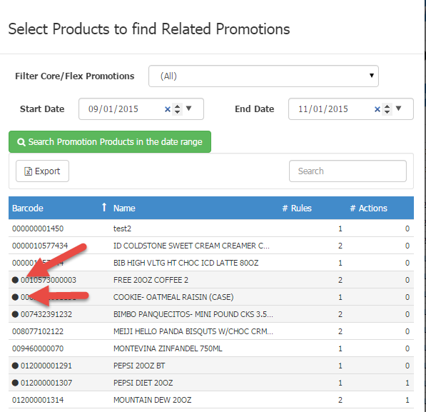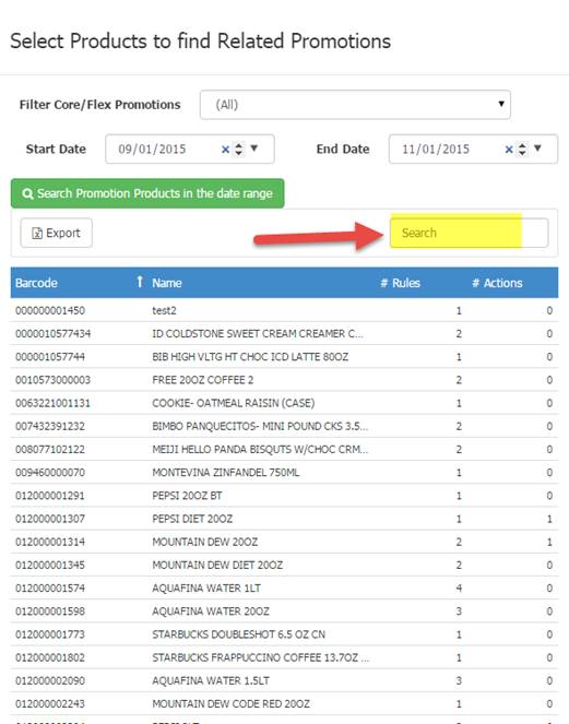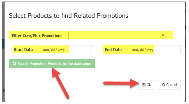 A search window will open where you can select all, core, or flex from the drop down and date range of the promotions you wish to search for. Enter the criteria and click “Search Promotion Products in the data range” as shown below:
