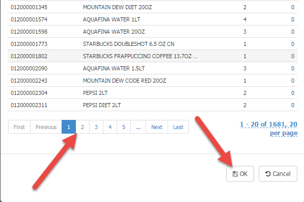 Once you see the items that you want to search for, hold down the CTRL key and click on the SKUs that you want to search for and a bullet will show them as tagged. #Rules = this is the # of promo rules that have that item in it. #Actions = this is the # of action rules that have that item in it. Then click ok to see your search…you can also toggle the pages by clicking the page numbers at the bottom: