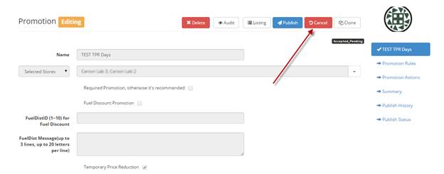 If you find a promotion or TPR was setup incorrectly or you need to cancel for some other reason, you can cancel an active promotion. To do this simply open the existing promotion under Marketing > Promotions and click CANCEL