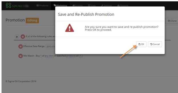 You can change the dates and item lists of a published promotion. To do this simply open the promotion and edit either field as needed, then save. Once you save, this window appears for you to click ok and republish the promotion to all the sites that are a part of the promotion. Note that only the date and item lists can be edited of a published promotion. If the sites are setup for auto accept it will push to the POS automatically. If not, the promotion will appear in the HQ notification screen to be re accepted and republished by the site.