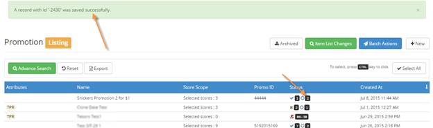 7- You will get a green confirmation at the top back on the main promotion screen. You will see that the new stores will show pending: