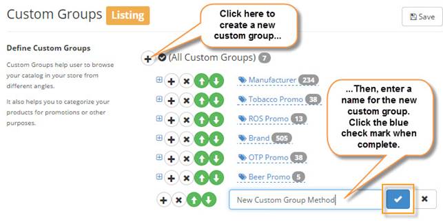 The Custom Groups Listing will display. The picture below explains how to create a new custom group.
