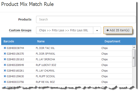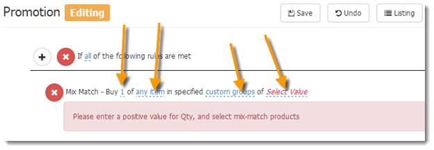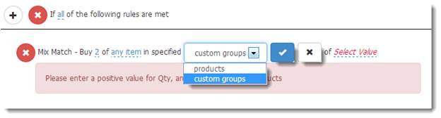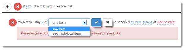 Product Mix Match Rule: This is to buy x # of items from 1 item list/custom group.