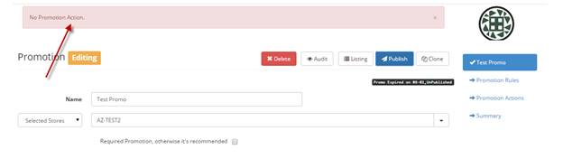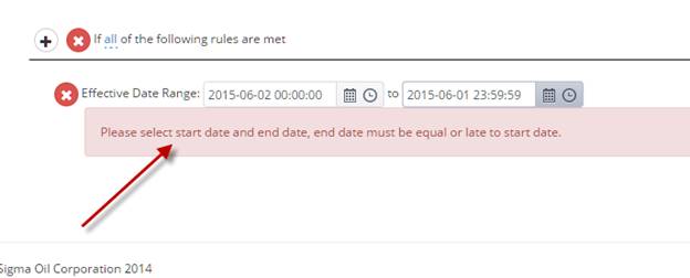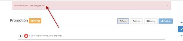 If the date range is invalid or rules or actions are missing, an error will appear after saving