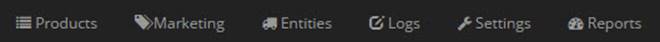 Once you login, all navigation resources will be available in the Navigation Bar divided in 6 basic sections; PRODUCTS, MARKETING, ENTITIES, LOGS, SETTINGS and REPORTS: