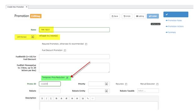 1. To create a TPR the first step is to enter all of the basic info on the TPR Promotion that you want to setup, at the minimum the name of the TPR and the stores you want to apply the TPR to.