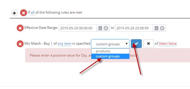 Then the Select Value field will be used to choose your custom groups to apply or to choose the products you want to use in this TPR.