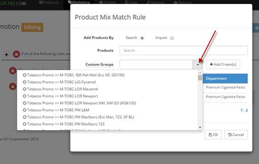 For custom groups you can choose from a custom group to identify the items you want to have in this TPR OR you can change the custom group default to product by clicking on custom groups and changing to products and clicking the blue arrow to save selection.