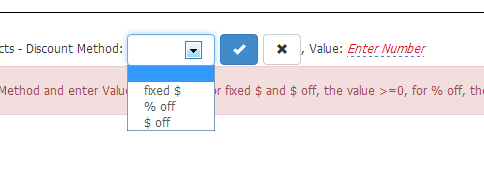 Then you must edit the Select Value to choose the discount method (fixed $, % off, $ off), and then enter the amount to match the discount method. This action will apply to all of the items selected. Again use the blue check mark to make your selections.