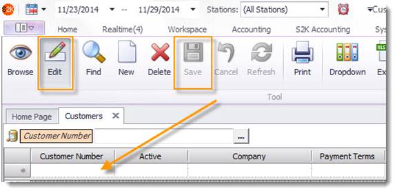 You can add a customer by clicking on the “NEW” tab and follow the steps, or to add a customer you can click on the edit button and enter in the customer information into the new line that appears (pictured below).