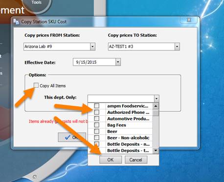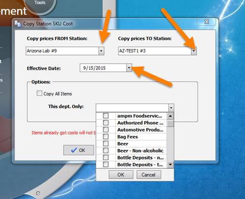 Then you need to decide if you are only copying cost for certain departments or ALL items. TO choose certain departments Uncheck the COPY ALL ITEMS box then checkmark the departments you wish to copy then click OK: