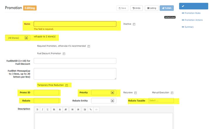 1- Enter the basic info for the promotion, name (required), station(s) (will default to all stores), Promo ID (optional), Priority (optional for Combo’s only), TPR checkmark (if applicable), Rebate amount and Rebate Taxable info (if applicable).