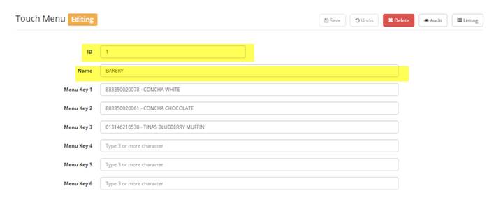 Touch Menus require an ID and name. All other fields are optional. CAUTION: Using an ID that already exists will cause indeterminate behaviors on the POS. Care must be taken to not create multiple menus that use the same ID. There is no automation to prevent a user from creating duplicate IDs.