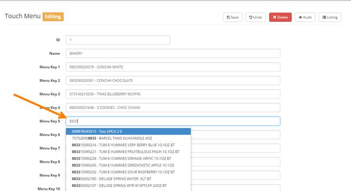 To add items to the menu simply begin typing the item number or description in the field next to the desired key position. At least three characters are required before the system will display matching results. Click on the matching item to add. The menu name entered in S2K is not the name which displays on the touch screen - this needs to be manually updated in SMS by a user with the appropriate access