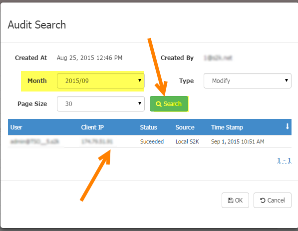 Clicking on the “Audit” button allows users to search for historical changed made by users for each menu. Simply enter the criteria and click SEARCH to view results: