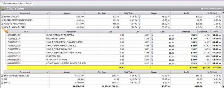 This shows your sales by department and item level with margins. You can expand any dept. by clicking on the “+” sign to see the items that were sold in the department for that particular day (pictured below).