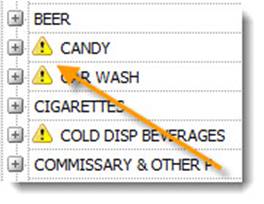 If you see the “!" Symbol in yellow (pictured below) that means that your Dept. sales do not match your SKU sales detail. This can be caused by items in different Depts. in S2K vs the POS, it can also be caused by sales in the Dept. and not at item level. This can also mean you had sales of items that do not exist in S2K. These symbols are indicators that there is something that needs your attention.