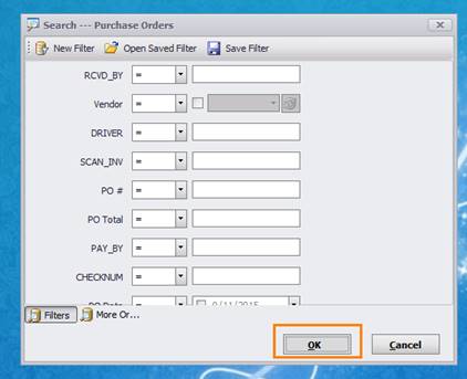 An optional filter window will appear. You can enter in details to filter your selection of existing purchase orders or you can just click OK for all to appear from newest to oldest:
