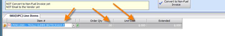 Then you can start entering your items in the Item # box along with the QTY and COST (Note: only items that were previously purchased or are flagged to the selected vendor will appear in your dropdown):