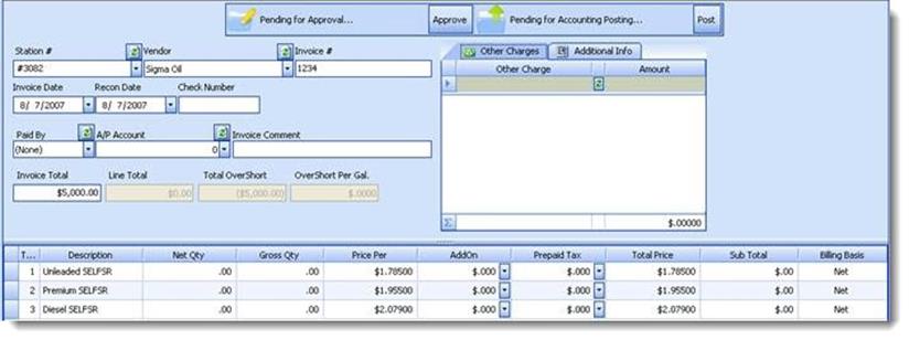 Entering new fuel invoices into S2K is simple. To do this, enter the following information in the screen shown below.