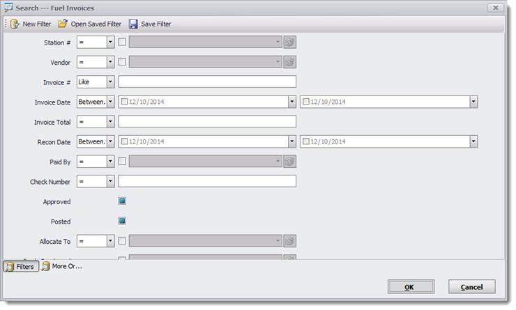You can search for invoices using from one to all of the search criteria seen below, including Station#, Vendor, Invoice #, Invoice Date, Invoice Total and Date. If you are trying to view all invoices for a specific date, this is method to use.