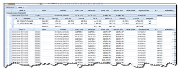 Below fuel invoices for Station #4847 are shown with details for the first invoice (to view details, simply click on the + sign to the left of the date). To open the invoice, double click on it.