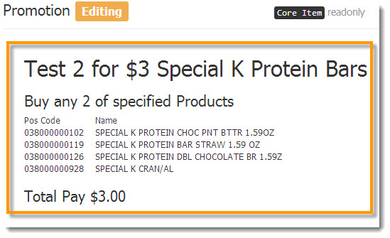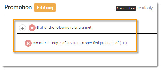 The promo explains the rules that need to be met in order for a promotion to take action. The promotion pictured below explains that the rule is that you have to buy at least 2 of ANY of the 4 items selected. Each word that is blue and underlined is a clickable field to change the rules of the promotion or add products available in the promotion.