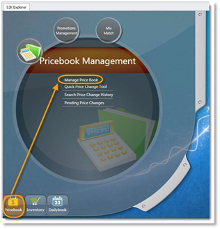 To open the price book manager tool, from the home screen click the Price Book button, then click the Manage Price Book link (pictured below).