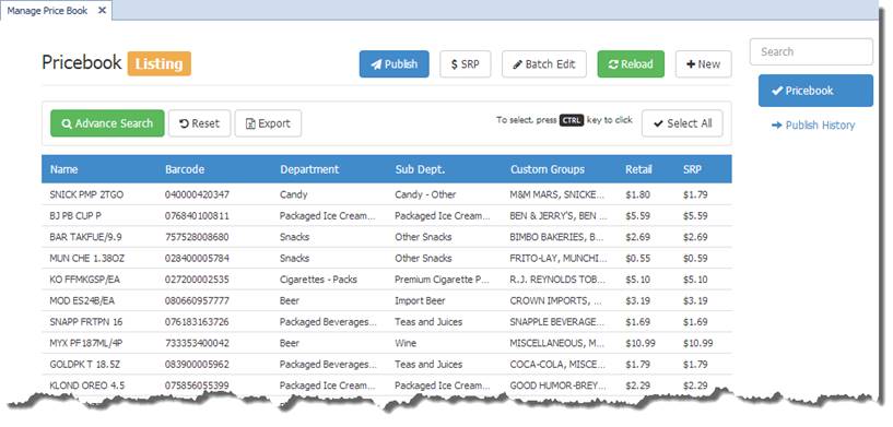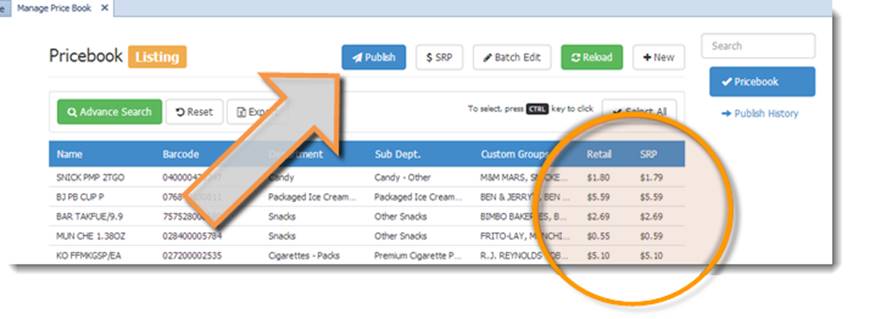 The SRP (Suggested Retail Price) and each store’s Retail will display (pictured below). Users can edit the store retail as needed and then click OK to put the edited items into the ‘pending price changes’ that are waiting to be published.