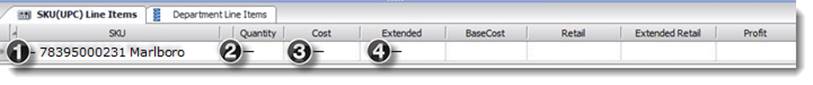 Enter the (1) SKU, Description or Supplier # in the first field on the blank invoice, then tab to the (2) Quantity field enter total individual items received in relation the UPC # (i.e.: if the UPC# is for 1pk of cigarettes and you bought a carton with 10pks in it then you’ll enter 10 for Quantity, and enter (3) Cost based upon 1 of the 10pks.