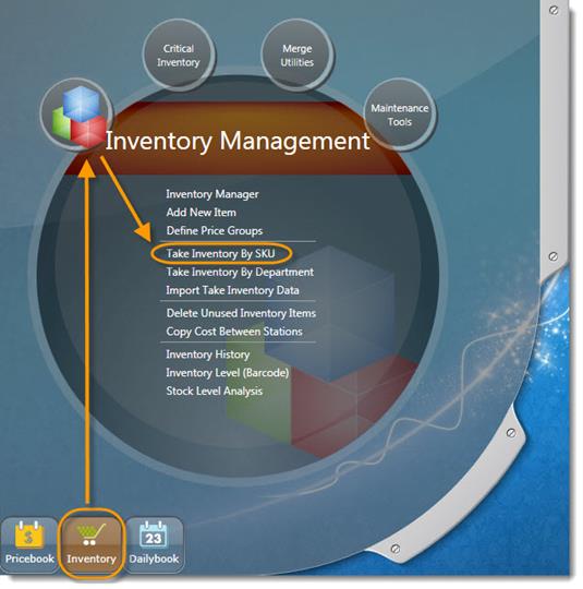 Once Inventory data has been downloaded into S2K, open the Back Office program on your PC. Click on Inventory, in the Inventory Management section click Take Inventory by SKU (pictured below).