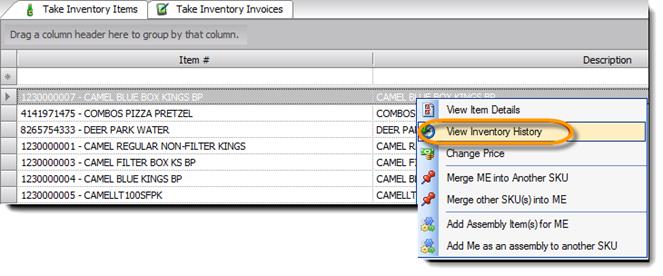 To look at the history of an item for research purposes, right click on the item and select ‘View Inventory History’. This will show all activity for the item selected.