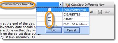 1. Total Inventory Taken For: Check the box next to each department that is a FULL department inventory. The system is designed to zero out any stock levels for items that are not included in the take, if the department box is checked.