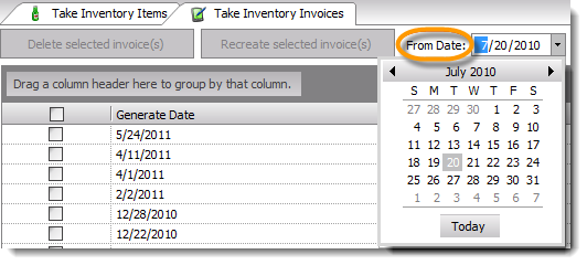 To delete or re-process an existing Take Inventory Invoice, click the box next to the desired inventory date and click either ‘Delete selected invoice(s)’ OR ‘Recreate selected Invoice(s)’.