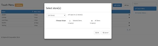 To publish Touch Menus to the POS click Publish in Touch Menu Listing. A dialog will be displayed allowing you to select the store scope and items will be published. Clicking OK will create the jobs to send the menus to the POS.