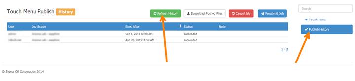 Click Publish History in the right hand column in Touch Menu Listing to see the status and history of these jobs, click “Refresh History” to view the history: