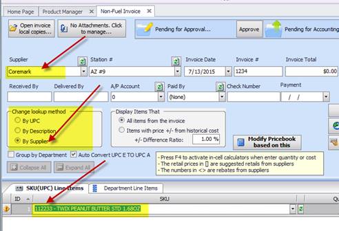 Some suppliers use their own identification or reference number for SKUs you purchase. So on their receipts you do not get the actual SKU but rather their own number for the item. This makes it very difficult to manually enter these purchases. In S2K we allow you to setup these item numbers by supplier. It takes a bit of work initially, but once you do this, entering these invoices in the future is very quick and painless. The alternative would be to search by description which is already in place in the non-fuel invoice entry screen.