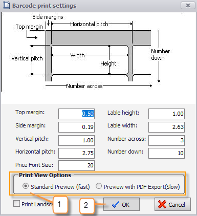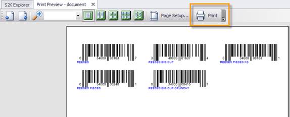 1. Preview with PDF Export allows you to export your barcodes, if necessary or use Standard Preview (fast) to print straight from S2K.