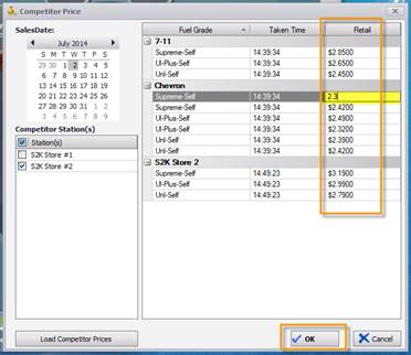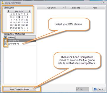 Select the sales date in the calendar, select your station then click the load competitor prices button at the bottom of the window.